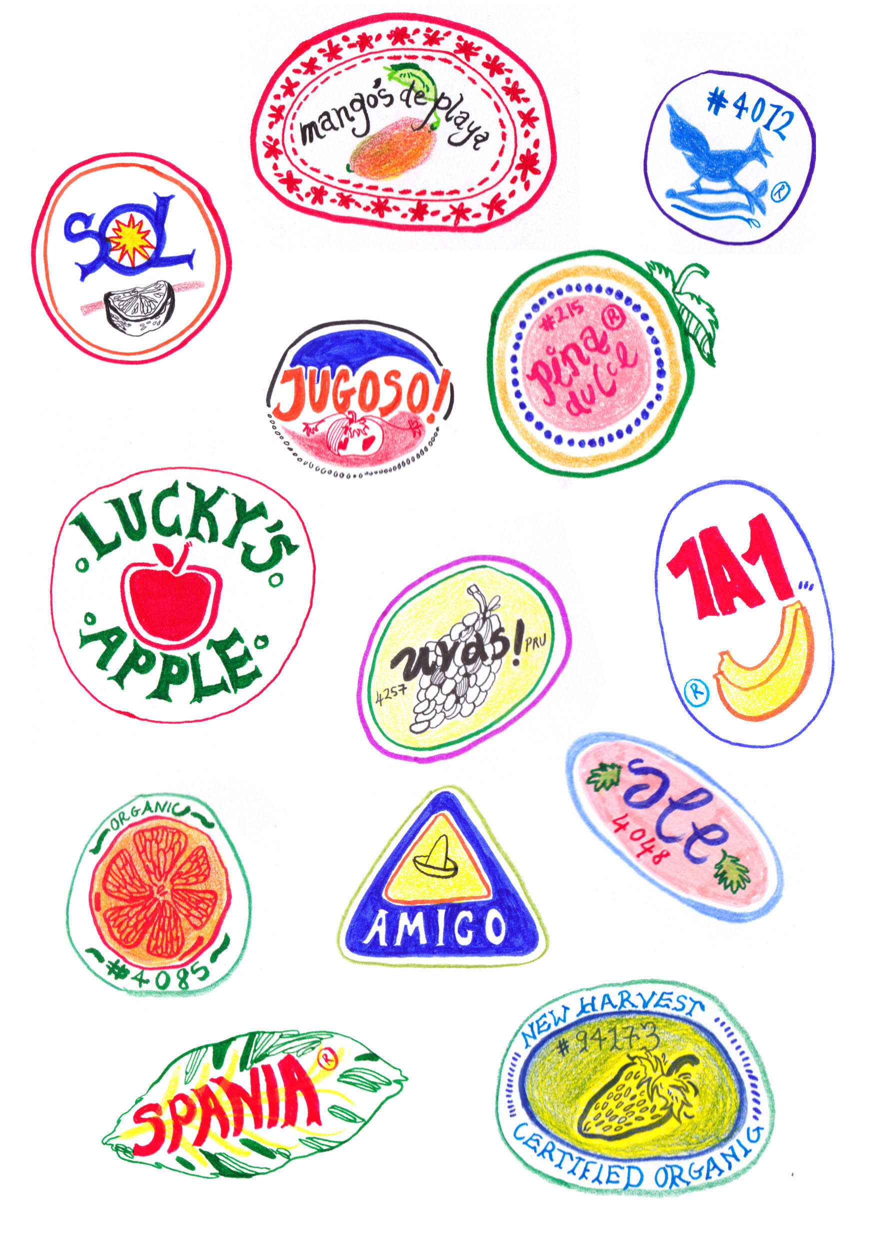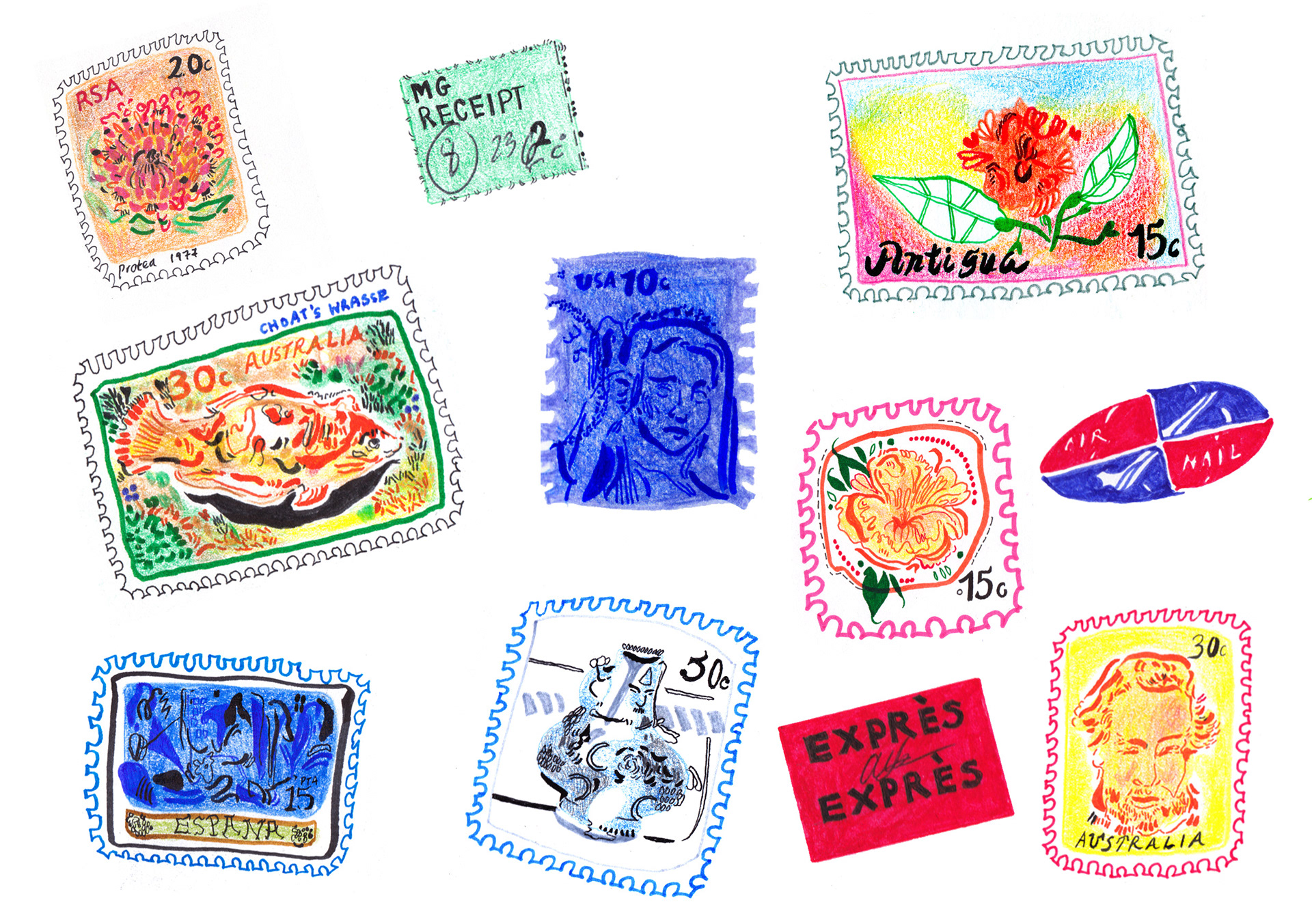 Illustrations of fabulously detailed stickers, stamps and other ephemera.