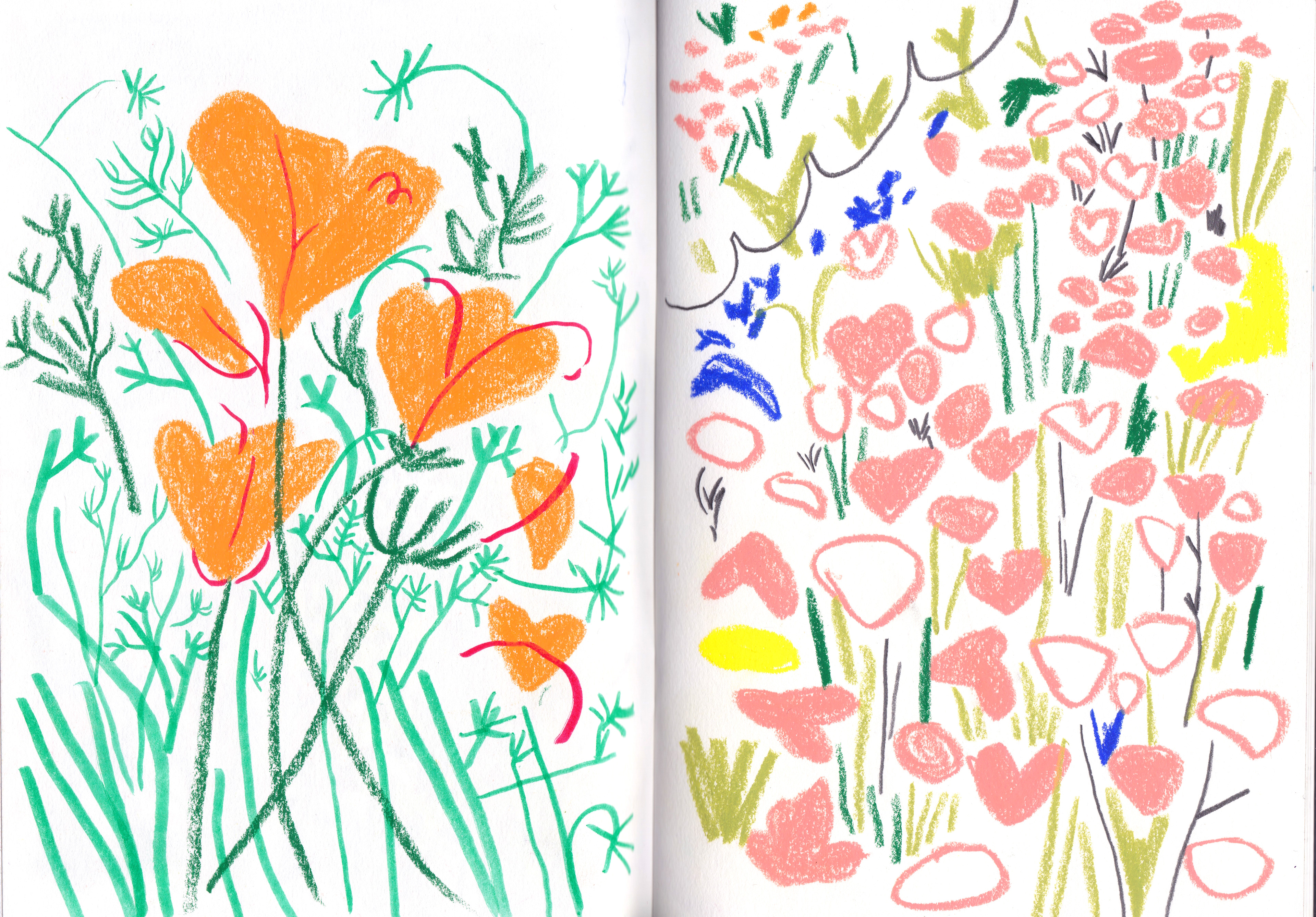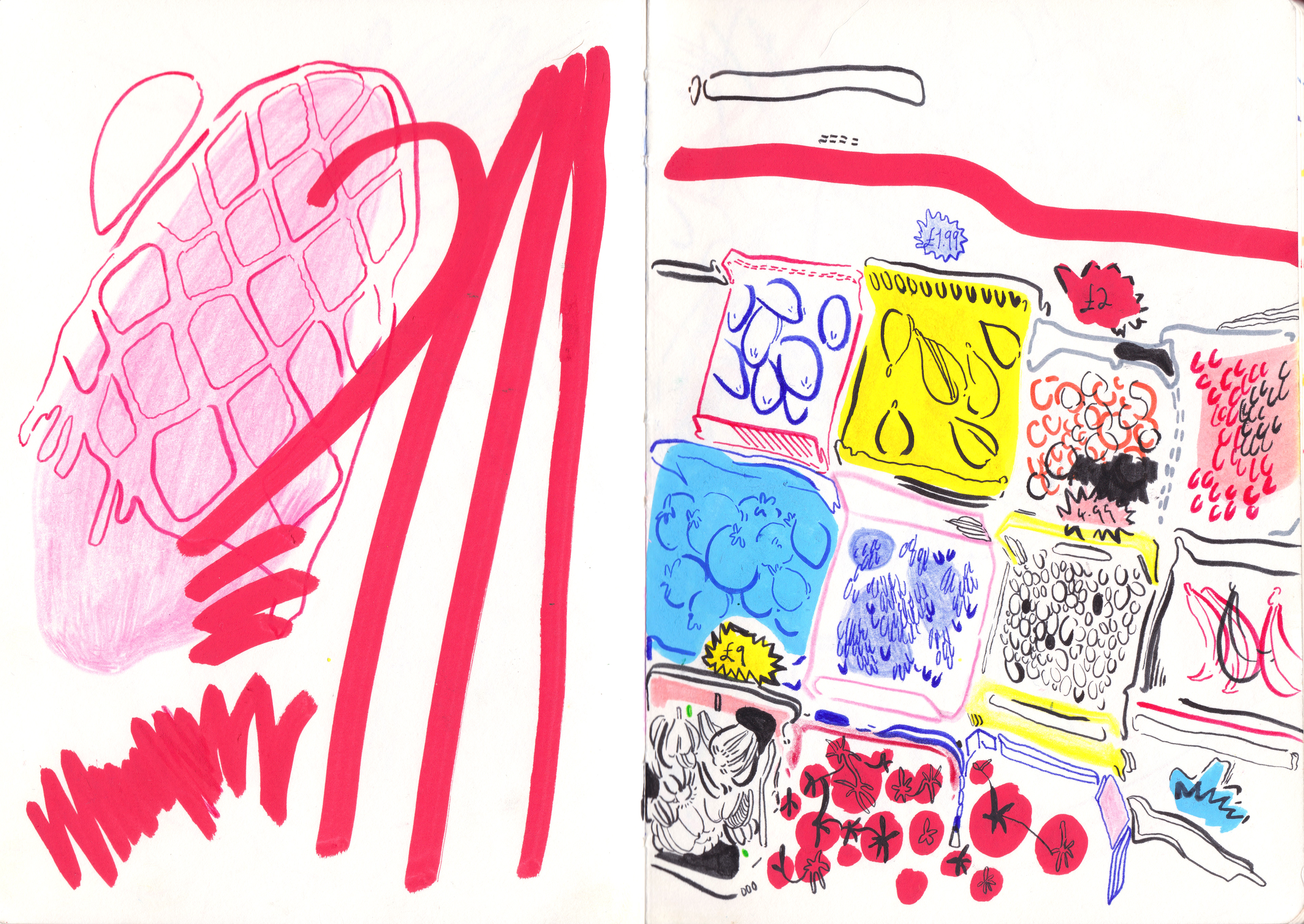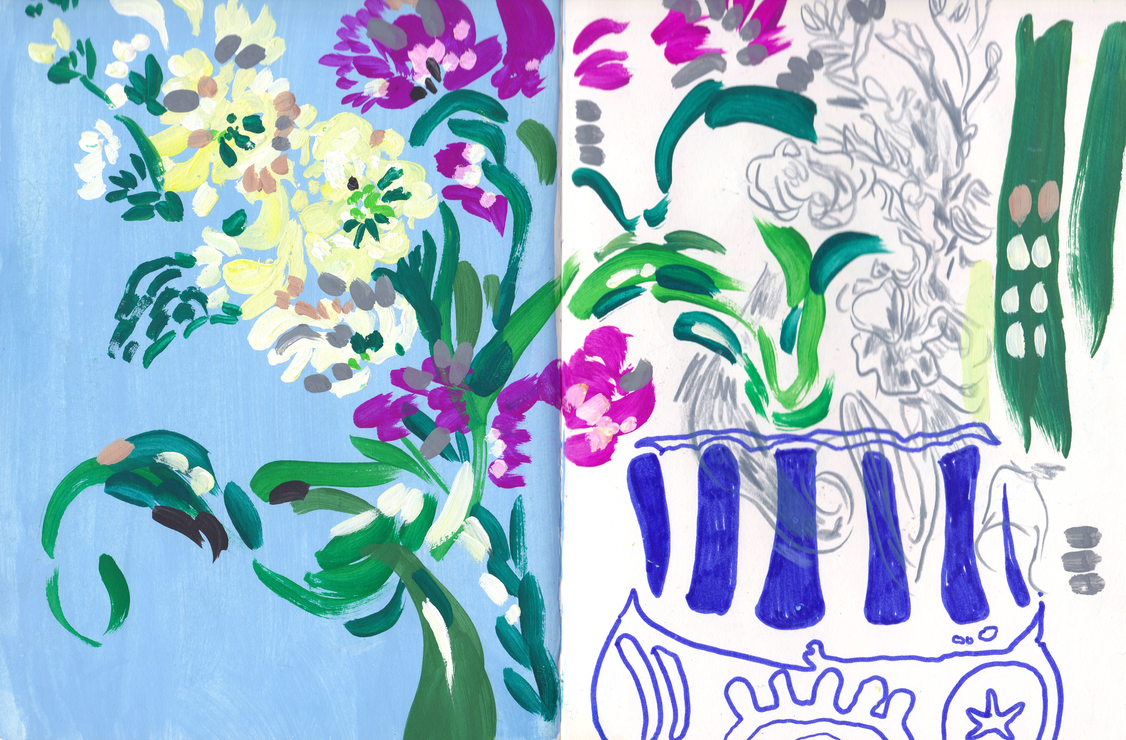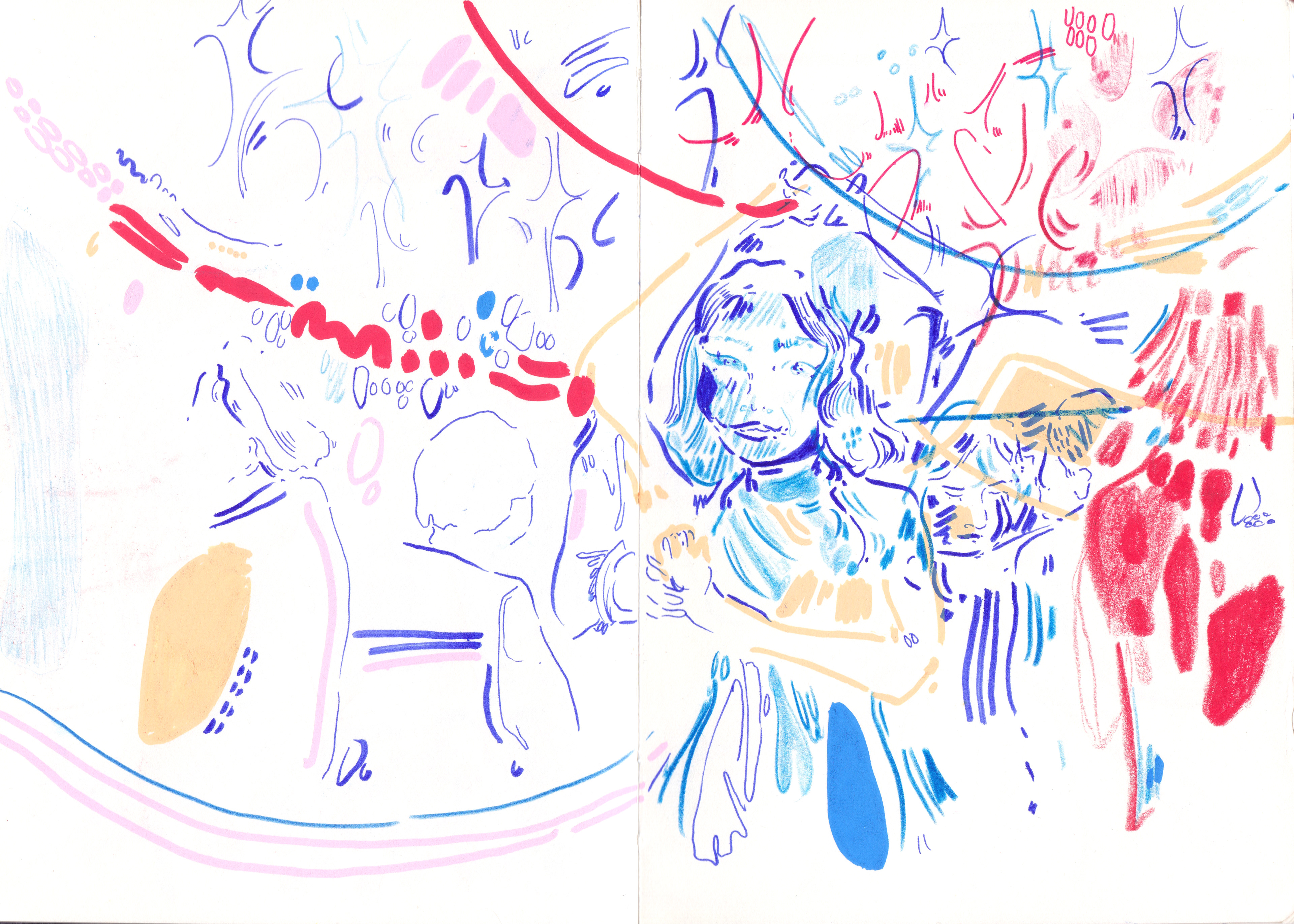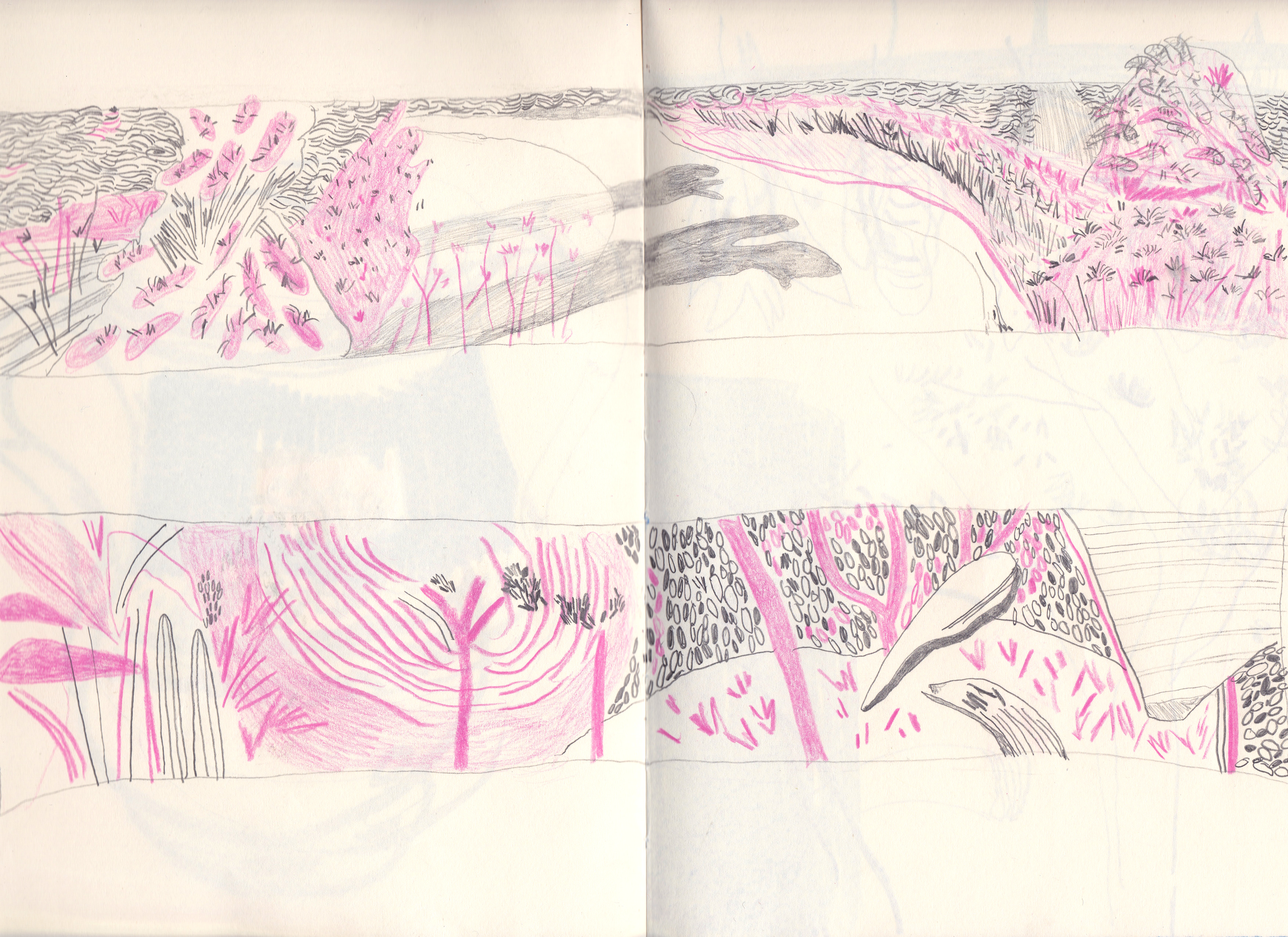 A selection of sketchbook spreads of my daily drawings and illustrations created on the go.